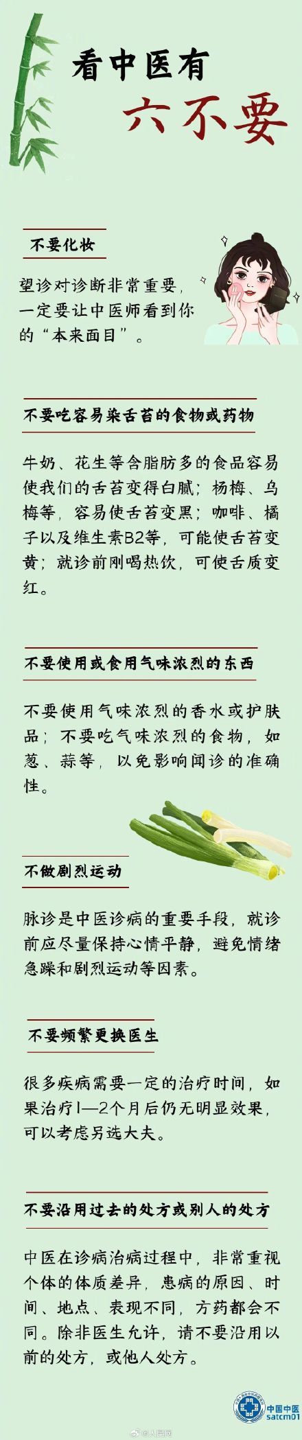 看中醫時要注意什么:①不要化妝;②不要吃容易染舌苔的食物或藥物;③不要使用或食用氣味濃烈的東西;④不做劇烈運動;⑤不要沿用過去的處方或別人的處方...