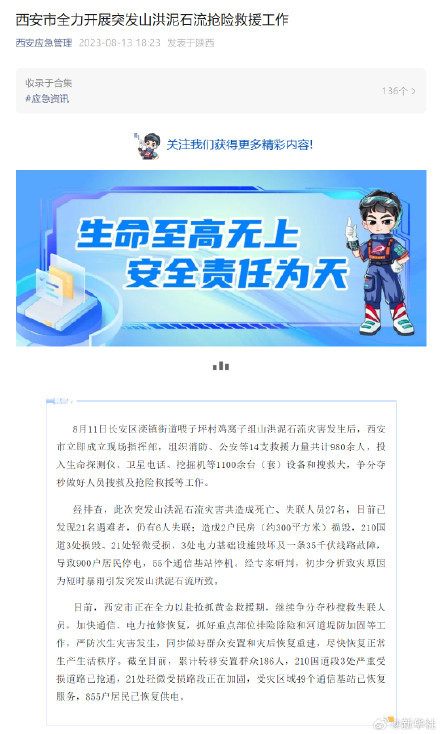 截至目前,累計轉移安置群眾186人,210國道段3處嚴重受損道路已搶通,21處輕微受損路段正在加固,受災區域49個通信基站已恢復服務,855戶居民已恢復供電。(西安應急管理微信公號)