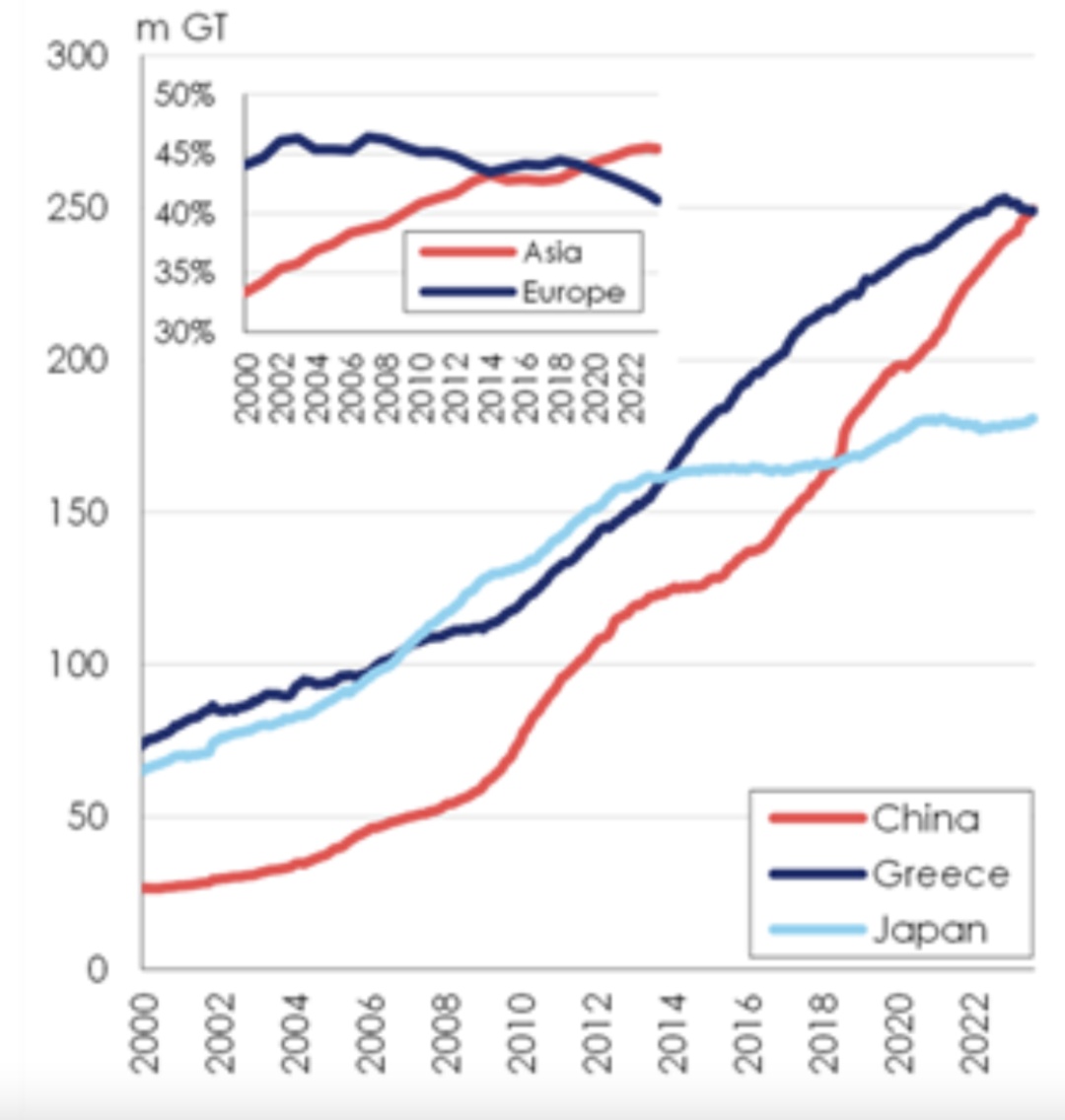 克拉克森研究公司研究人員表示,自2015年以來,在干散貨船和集裝箱船投資的支持下,中國船隊經歷了強勁增長,使其在全球排名中處于領先地位。數據顯示,中國船東的干散貨船隊總噸占比為24%,集裝箱船隊的總噸占比為16%。不過,數據顯示,按照載重噸計算,希臘仍占據著最大份額(18%)。