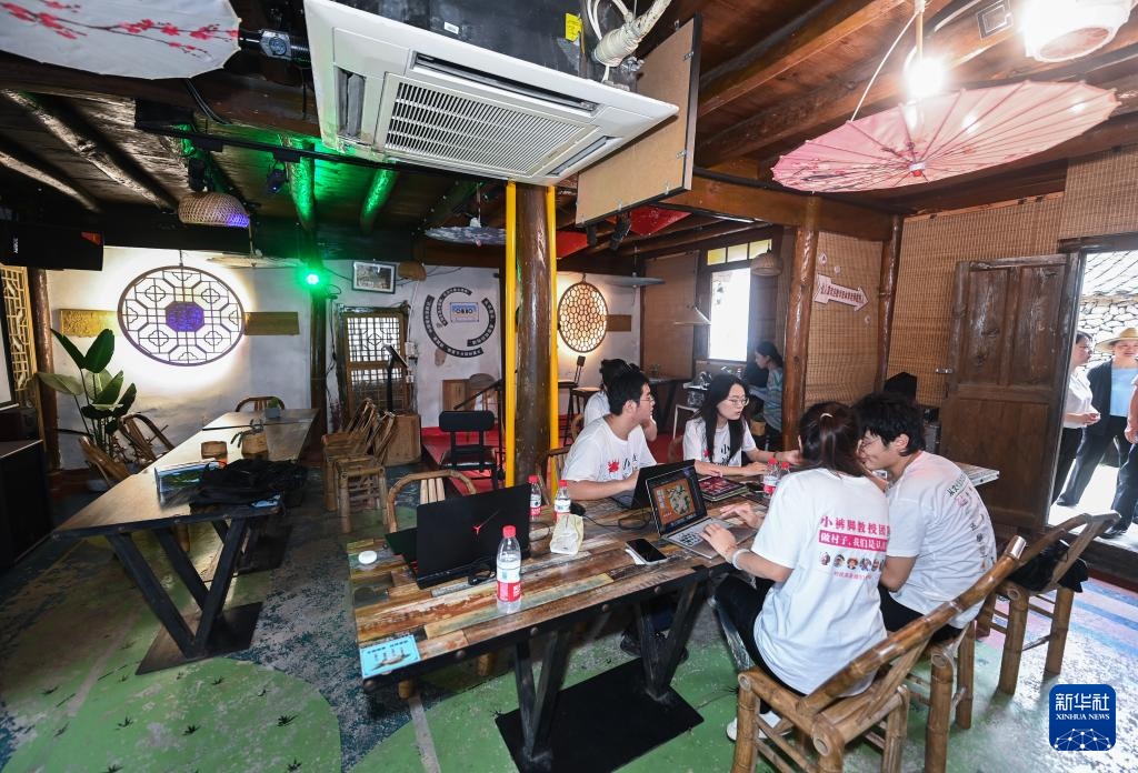 8月11日,高校藝術院系的大學生們在葛家村的特色酒吧內討論村落藝術改造提升的設計方案。