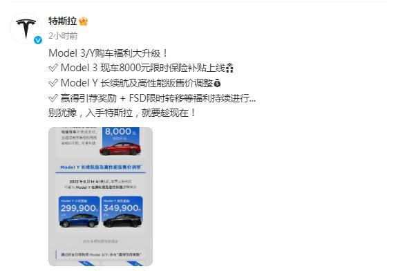 據特斯拉官方微博14日消息,特斯拉Model 3現車8000元限時保險補貼上線。2023年8月14日起,ModelY長續航版起售價從31.39萬元調整為29.99萬元,Model Y高性能版從36.39萬元調整為34.99萬元。