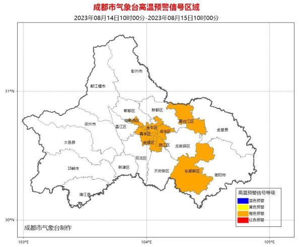 截至今日10時00分,天府新區、新都、龍泉驛、彭州、金堂、溫江、郫都、蒲江、新津和雙流的高溫橙色預警信號仍在生效中,大邑和崇州已發布高溫橙色預警信號,其余區(市)縣將根據氣溫發展情況,適時發布高溫預警信號。