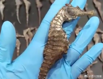近日,廣州白云機場海關關員對一架進境航班進行監管時,海關發現行李異常堆滿小鉤子,并在無申報通道將攜帶該行李通關的旅客精準攔截。經開箱查驗在行李箱內發現有大量用透明密封袋包裝的海馬干,共計8980尾,重15.4千克。隨后,關員又在兩架進境航班中查獲2名旅客違規攜帶海馬干進境,共計611尾,重1.33千克。(來源:海關發布)