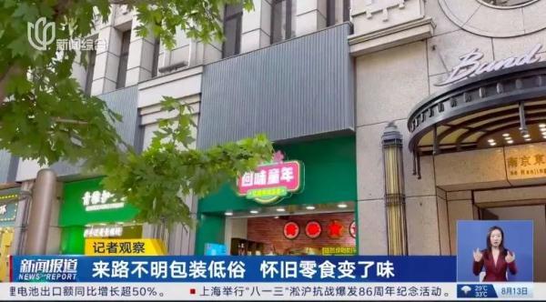 隨后,記者走訪了南京東路、田子坊等市中心熱門商圈的多家懷舊零食店,發現幾乎每家都有不少類似的商品。除了包裝"三俗",一些零食的外包裝上,連生產日期都沒有。