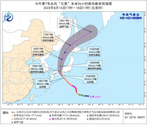 預計,“蘭恩”將以每小時10-15公里的速度向西北方向移動,強度變化不大,逐漸向日本本州島南部沿海靠近,并將于15日早晨到上午在上述沿海登陸(30-35m/s,11-12級,強熱帶風暴級或臺風級),15日夜間開始在日本海東南部轉(zhuǎn)向北偏東方向移動,強度逐漸減弱。