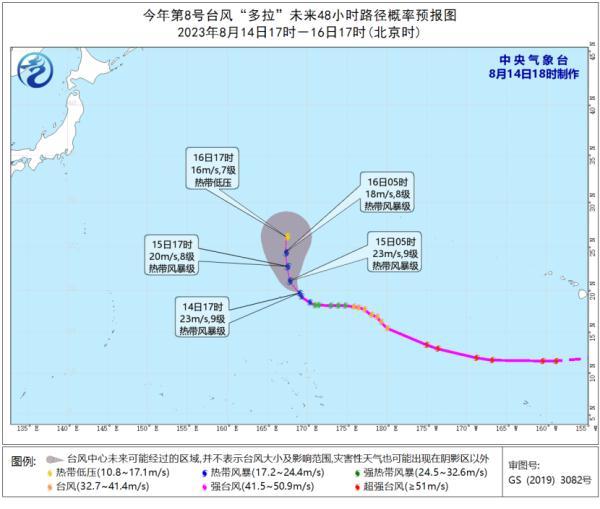 今年第8號臺風“多拉”(DORA)(熱帶風暴級)的中心今天(14日)下午5點鐘位于美國關島東偏北方向約2670公里的西北太平洋洋面上,就是北緯19.7度、東經(jīng)169.0度,中心附近最大風力有9級(23米/秒),中心最低氣壓為990百帕,七級風圈半徑130-180公里。