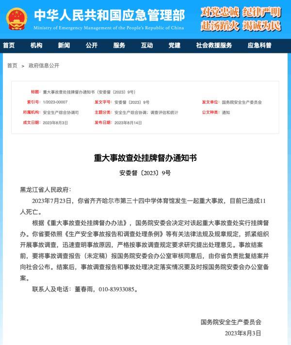 7月23日,黑龍江省齊齊哈爾市第三十四中學體育館發生一起重大事故,目前已造成11人死亡。根據《重大事故查處掛牌督辦辦法》,國務院安委會日前決定對該起重大事故查處實行掛牌督辦。