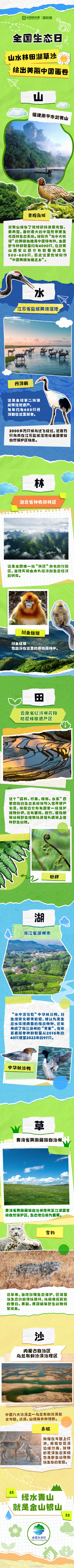2005年8月15日,綠水青山就是金山銀山科學論斷首次提出。18年后的今天,我國迎來首個全國生態日。這個首創性、標志性、獨特性的紀念日,彰顯了全面推進美麗中國建設的堅定決心,“綠水青山就是金山銀山”有了更加豐富的內涵。山水林田湖草沙,從每種自然樣貌里,看見美麗中國。