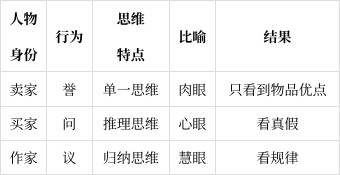 找到第三者,深思矛與盾。先讓學生找到故事中的三個人:一個是賣家,一個是買家,還有一個是作家。再讓學生思考三個人是怎么說的?賣家是“譽”,也就是夸耀,夸耀自己的產品;買家是“問”,問是否貨真價實,性價比是不是很高;作家是“議”,作家是超越買家和賣家的,站在旁觀者的角度,發現現象背后的真理、規律。抓住“譽”“問”“議”這三個關鍵詞,這個故事就讀懂、讀透了。最后讓學生思考三種說法背后藏著的三種思維。第一種思維——賣家思維,賣家的“肉眼”只看到物品的優點,他的“譽”是單一思維;第二種思維——買家思維,買家的“心眼”看真假,他的“問”是推理思維;第三種思維——作家思維,作家用“慧眼”看規律,通過兩個人的爭辯,能夠找到其中的規律,他的“議”是歸納思維。找到三只不同的眼睛,三種不同的思維方法,人物的思維過程就被破解了。