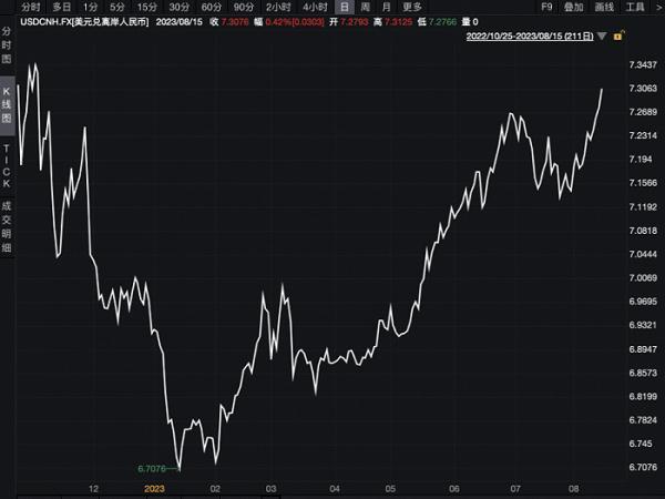 8月15日,離岸人民幣兌美元跌破7.30關口,續創2022年11月以來新低,日內跌超300個基點。