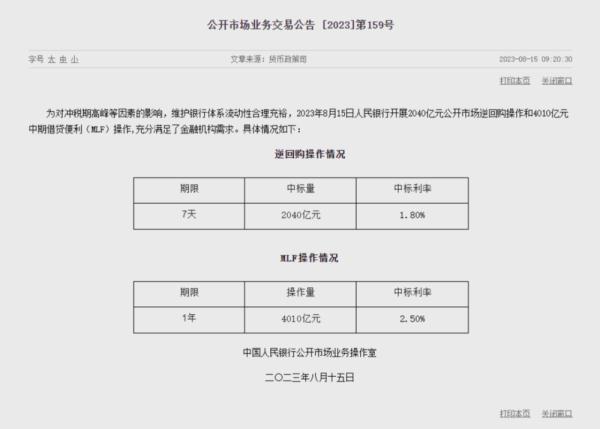 8月15日,人民銀行發(fā)布消息稱,為對(duì)沖稅期高峰等因素的影響,維護(hù)銀行體系流動(dòng)性合理充裕,人民銀行開展2040億元公開市場(chǎng)逆回購(gòu)操作和4010億元中期借貸便利(MLF)操作,充分滿足了金融機(jī)構(gòu)需求。其中,MLF利率下調(diào)15個(gè)基點(diǎn)至2.5%;7天期逆回購(gòu)利率下調(diào)10個(gè)基點(diǎn)至1.80%。