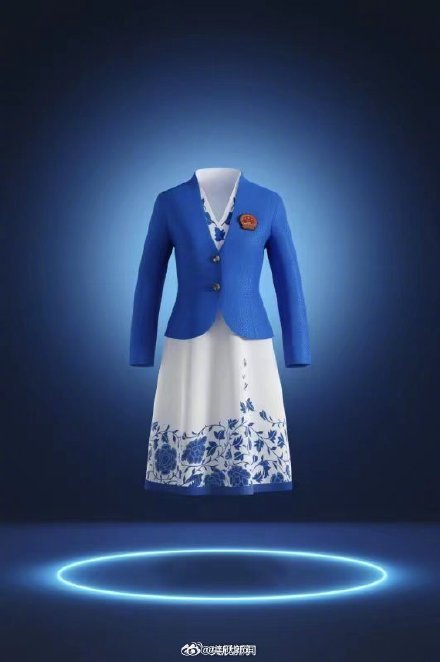 白與藍的主色調碰撞出閃耀星辰的遐想,象征著群星閃耀的體育拼搏精神,禮服設計上還融入了青花瓷、牡丹等中國元素,彰顯中國文化魅力。