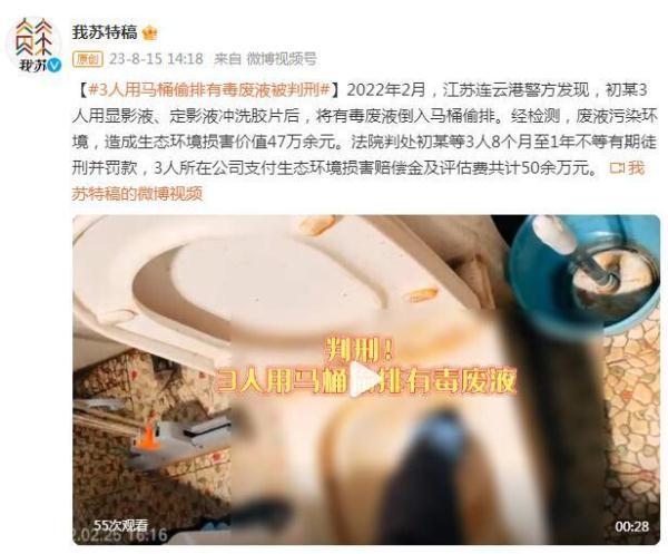 2022年2月,江蘇連云港警方發現,初某3人用顯影液、定影液沖洗膠片后,將有毒廢液倒入馬桶偷排。經檢測,廢液污染環境,造成生態環境損害價值47萬余元。法院判處初某等3人8個月至1年不等有期徒刑并罰款,3人所在公司支付生態環境損害賠償金及評估費共計50余萬元。