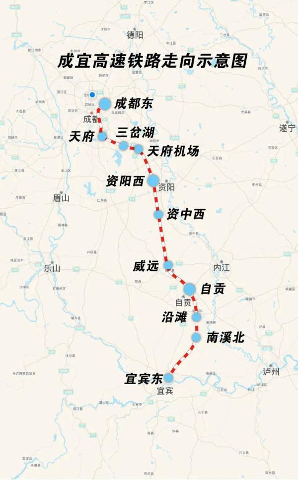 成宜高鐵是四川省首條時(shí)速為350公里的高鐵,國家“八縱八橫”高速鐵路網(wǎng)“京昆通道”的重要組成部分。線路建成通車后,從成都到自貢僅需40分鐘、到宜賓僅1小時(shí)左右;在宜賓接渝昆高鐵,還將形成全程時(shí)速350公里的出川大通道,以及川南城市到重慶的高鐵新通道。全線共設(shè)11個(gè)車站,其中成都東和自貢為既有車站,新建天府、三岔湖、天府機(jī)場、資陽西、資中西、威遠(yuǎn)、沿灘、南溪北、宜賓東等9座車站。