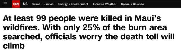 據美國有線電視新聞網報道,美國夏威夷州州長喬什·格林就在當地時間周一時承認,盡管已有99人在這場已經成為美國過去100多年以來最致命的山火災難中喪生,但遇難人數可能會翻倍增加。