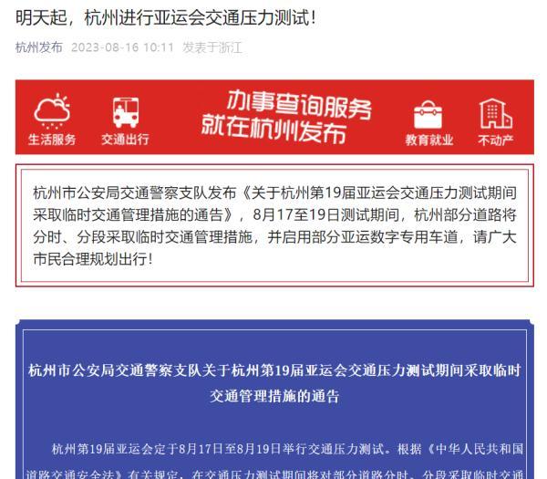 杭州市公安局交通警察支隊關(guān)于杭州第19屆亞運會交通壓力測試期間采取臨時交通管理措施的通告