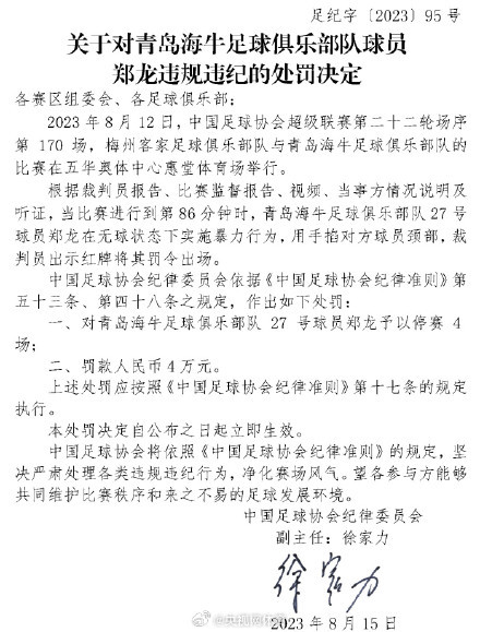 北京時間8月16日,中國足協官方公告,青島海牛球員鄭龍因鎖喉梅州客家外援科索維奇,被處于停賽4場、罰款4萬元。中超第22輪,梅州客家1-0青島海牛,第89分鐘,鄭龍與科索維奇發生沖突,主裁傅明通過VAR回放,最終出示紅牌將鄭龍直接罰下,向科索維奇出示黃牌警告。
