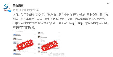 據@蕭山發布:近日,關于“轉運珠式賣淫”“杭州有一條產業鏈”的相關言論在網上流傳,經官方核實,系不實信息。目前,發布人賈某(女,22歲)因虛構事實擾亂公共秩序,已被公安機關依法作出行政拘留處罰。請大家不信謠不傳謠,非經權威渠道證實,不要輕信盲目轉發。
