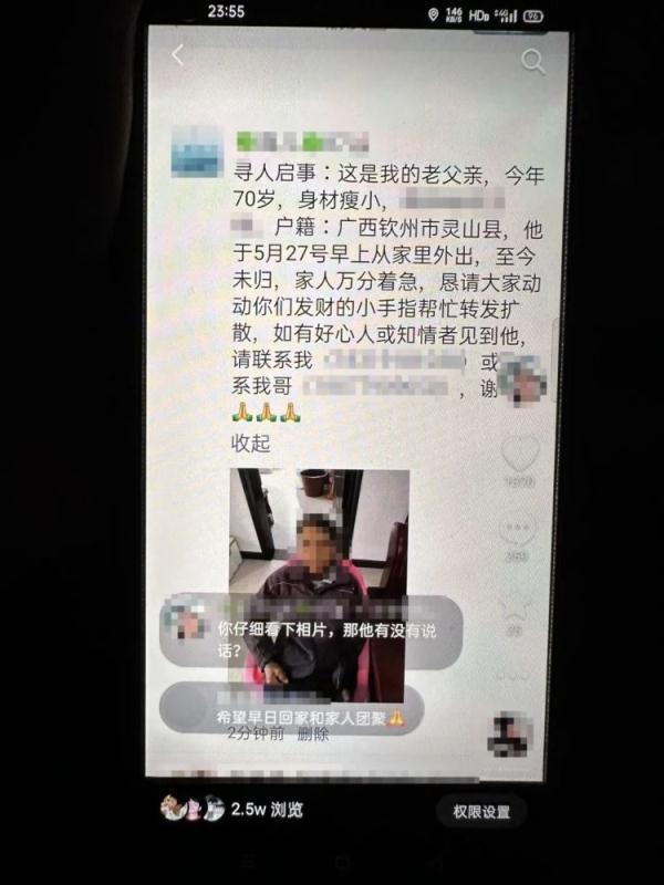 據了解,陳伯早在5月27日就離開廣西的家,因其此前曾有類似“出游”經歷,家人起初并未太在意,直至聯系不上才意識到他可能迷路。