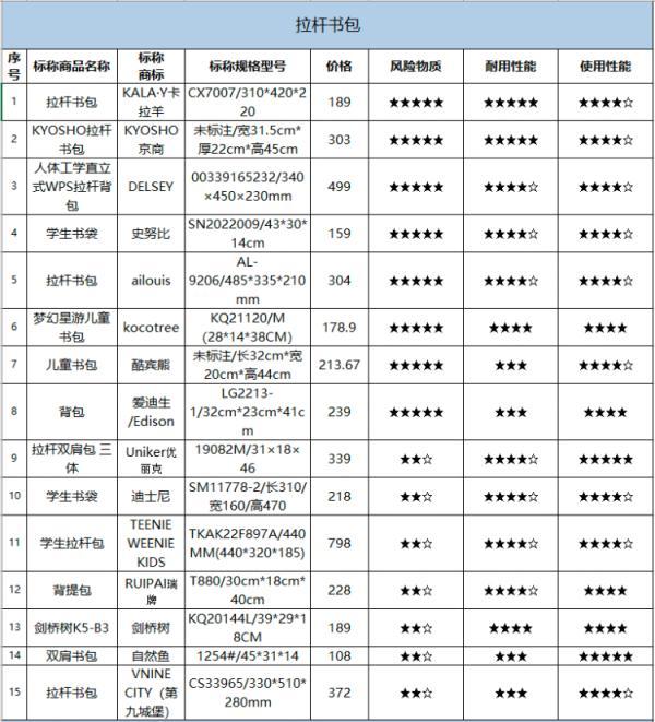 上海市消保委消費(fèi)指導(dǎo)部專員顧琦珺介紹,針對消費(fèi)者反映的問題,這次實(shí)驗(yàn)購買了市場上熱銷的30款兒童書包,其中護(hù)脊書包和拉桿書包各15款,價格從108元至899元不等,對樣品的風(fēng)險物質(zhì)、使用性和耐用性進(jìn)行了測試。