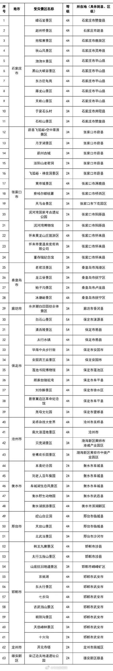 據河北旅游微信公眾號消息,自河北洪澇災害發生以來,河北省文化和旅游廳積極行動,迅速響應,主動作為,全面梳理全省文化旅游和文物領域受災情況。經過災后搶修和維護,河北受災景區大部分已具備開放條件,恢復開放。截至8月15日,全省共有63家受災A級旅游景區開放。