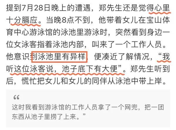“游泳館的工作人員拿了一個網兜,把一團東西從池子里撈了上來,扔到了垃圾桶里。”因為“不敢相信”,他還特地走過去核實,“果然就是糞便,還散發出一股臭味”!