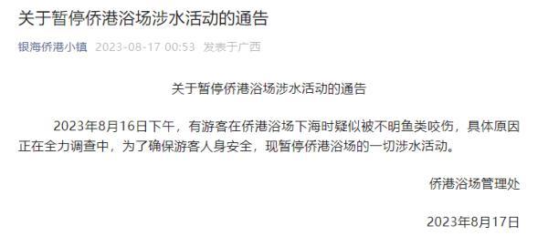 8月17日凌晨,北海市銀海區(qū)僑港鎮(zhèn)人民政府微信公眾號“銀海僑港小鎮(zhèn)”發(fā)布《關(guān)于暫停僑港浴場涉水活動的通告》,通告稱8月16日下午,有游客在僑港浴場下海時(shí)疑似被不明魚類咬傷,具體原因正在全力調(diào)查中,為了確保游客人身安全,現(xiàn)暫停僑港浴場的一切涉水活動。