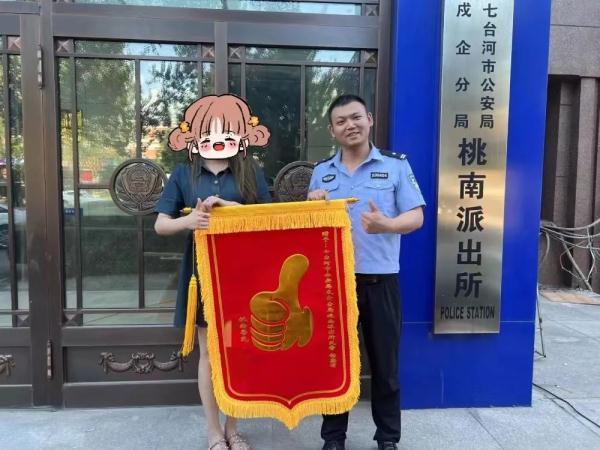 的錦旗送至七臺河市公安局戍企分局桃南派出所民警楊鑫有手中,錦旗上的