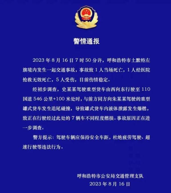 16日晚22時33分,呼和浩特市公安局官方微信公眾號發(fā)布警情通報,顯示事故致1人當場死亡,1人經(jīng)醫(yī)院搶救無效死亡。