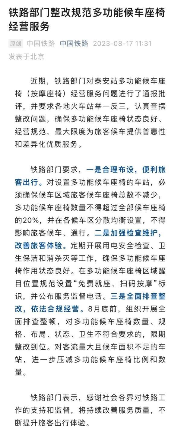 文中指出,近期,鐵路部門對泰安站多功能候車座椅(按摩座椅)經(jīng)營服務(wù)問題進(jìn)行了通報批評,并要求各地火車站舉一反三,認(rèn)真查擺整改問題,確保多功能候車座椅狀態(tài)良好、經(jīng)營規(guī)范,最大限度為旅客候車提供普惠性和差異化優(yōu)質(zhì)服務(wù)。