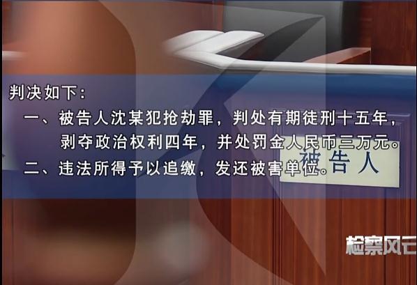 一、被告人沈某犯搶劫罪,判處有期徒刑十五年,剝奪政治權(quán)利四年,并處罰金人民幣三萬元。