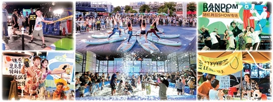 除了常見的市集擺攤,夜市更多的空間留給了運動和交友。夜市最“吸睛”的是演出舞臺,被稱為夏YEAH(諧音“夏夜”——記者住)舞臺。從17時30分到22時,這里輪番上演各種小型演出和互動活動:迎亞運青春音樂節、隨機舞蹈SHOW、街舞、槳板瑜伽……每個演出都有現場游客被邀請上臺,一起體驗。