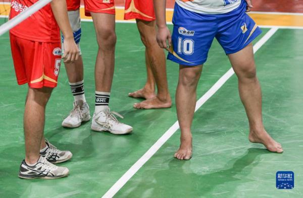 一場“村排”比賽中,部分隊員赤腳上場參賽(7月1日攝)。在文昌,很多人從小就習慣赤腳打排球。