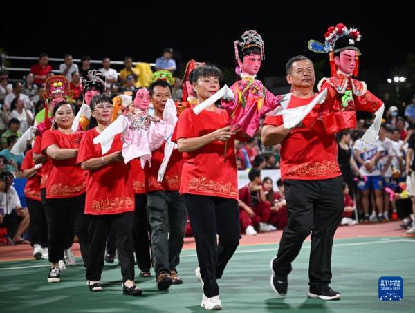 在“村排”決賽現場,演員帶著具有文昌特色的公仔戲木偶亮相球場(8月13日攝)。