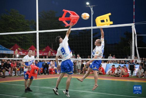 “村排”龍樓站賽間,球員們用凳子打排球,為觀眾表演具有文昌特色的“凳子排球”(7月1日攝)。