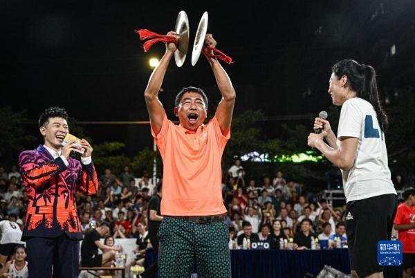 “村排”決賽現場,觀眾在賽前互動中爭搶前中國女排隊員魏秋月、李穎的簽名排球(8月13日攝)。