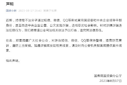 近期,持續有不法分子通過短信、微信、QQ等形式冒用國資委和中央企業領導干部身份,甚至偽造中央企業公章、公文實施詐騙,造成惡劣社會影響。針對涉嫌詐騙違法犯罪行為,我們將商請公安司法機關依法予以打擊,追究其法律責任。