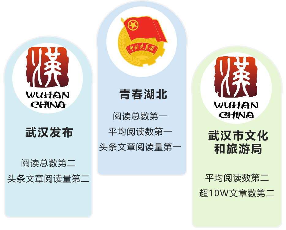 從單項指數看,文章發布總數、閱讀總數、點贊總數等指數出現小幅波動。在TOP100榜單中,近六成賬號文章發布數量上升,有15個賬號發文超200篇,分別為“最紅安”“硚口發布”“英山融媒”“今點黃州”“武漢發布”“荊州發布”“蘄春網”“黃石發布”“天門發布”“咸寧發布”“湖北福彩”“秀美浠水”“武穴發布”“洪山大學之城”“宜昌發布”;九成賬號文章閱讀總數上升,有14個賬號閱讀總量過100萬次,其中“青春湖北”“武漢發布”“宜昌發布”“最紅安”“武漢市文化和旅游局”優勢明顯,依次為1102W+、709W+、318W+、208W+、180W+。