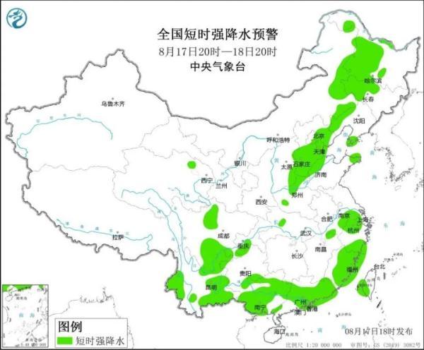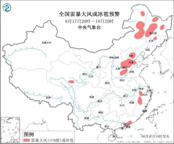 預(yù)計8月17日20時至18日20時,內(nèi)蒙古東部、黑龍江中西部、吉林西部、河北中南部和東北部、北京東部、天津、河南北部、安徽南部、江西北部、浙江中部、福建西北部等地的部分地區(qū)將有8-10級雷暴大風(fēng)或冰雹天氣;內(nèi)蒙古東部、黑龍江中西部、吉林中西部、遼寧西部、山西南部、河北、北京東部和西南部、天津、山東北部、河南北部、安徽南部、江蘇南部、上海西部、浙江北部和南部、福建、四川中部、貴州西北部、云南、廣西、廣東、臺灣島南部等地的部分地區(qū)將有短時強降水天氣,最大小時雨量30-50毫米,局地可達60毫米以上。