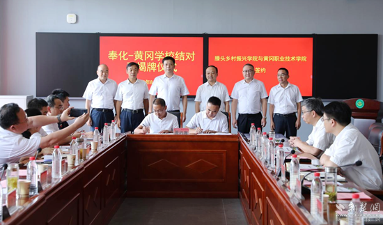 荊楚網(湖北日報網)訊(通訊員劉洋)8月17日上午,奉化-黃岡學校結對及滕頭鄉村振興學院黃岡分院揭牌儀式在黃岡職院舉行,雙方簽訂《滕頭鄉村振興學院 黃岡職業技術學院共建滕頭鄉村振興學院黃岡分院框架協議》,將積極開展鄉村振興人才培訓,不斷提高人才培養培訓質量,推廣浙江共富模式,賦能黃岡鄉村高質量發展。