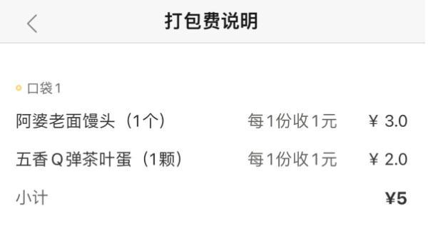 有記者在外賣平臺某門店下單發現,一個老面饅頭價格為1.9元,按照包裝收費標準,每份饅頭需額外收取1元打包費;一枚2.9元的茶葉蛋,也要按每份1元收取打包費。