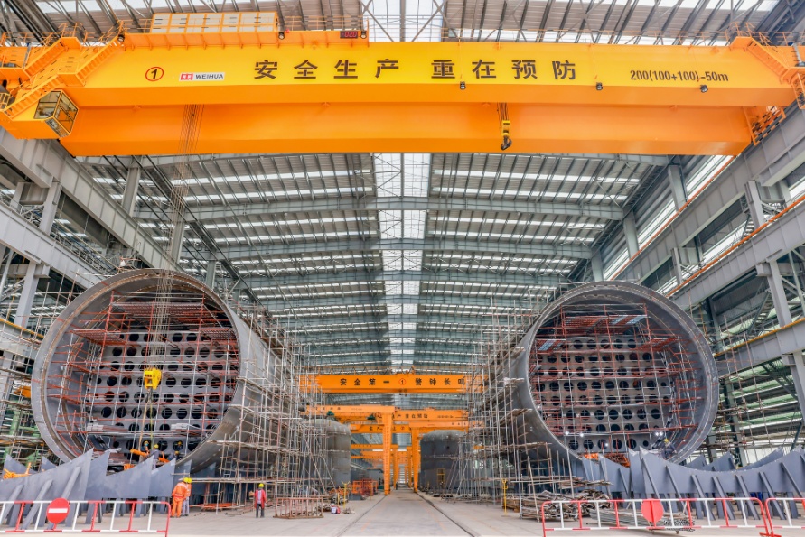 △圖為新時代造船LNG罐體生產(chǎn)現(xiàn)場。