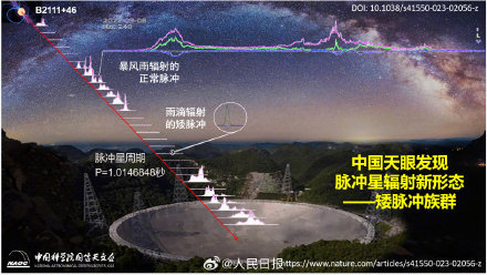 北京時間8月18日,國際科學期刊《自然·天文》發表了中國科學院國家天文臺韓金林研究員領導的王綬琯巡天突擊隊的新成果,該團隊利用中國天眼FAST成功探測并解析了一批脈沖星B2111+46磁層中零星雨滴般的微弱矮脈沖輻射,這種矮脈沖輻射族群是國際上其他射電望遠鏡難以觀測的脈沖星輻射新形態,揭示了脈沖星輻射瀕臨熄滅時其磁層結構基本不變的物理事實。此次矮脈沖族群的發現為研究脈沖星輻射難題研究打開了一個新窗口,對揭示脈沖星磁層物理及其極端等離子體環境具有重要的科學意義。(記者吳月輝 圖/中國科學院國家天文臺)