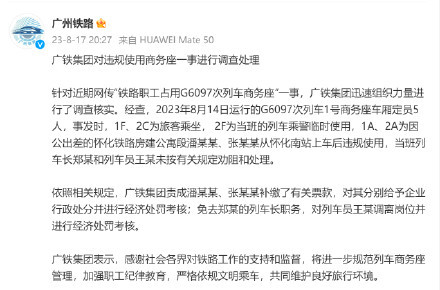 8月17日晚,廣鐵集團在官方微博上發布對職工違規使用商務座一事調查處理結果,全文如下: