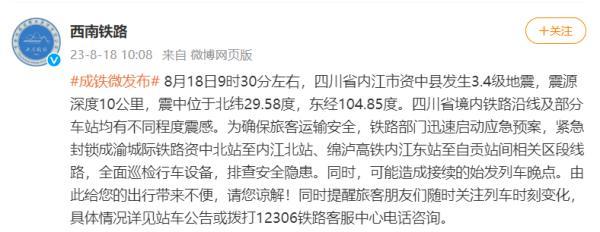 8月18日10時08分,西南鐵路官方微博發(fā)布消息,稱受地震影響,四川省境內(nèi)鐵路沿線及部分車站均有不同程度震感。