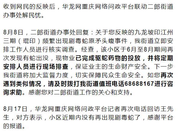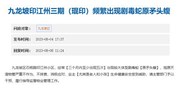 8月4日,家住九龍坡區石楊路印江州小區的王先生在重慶網絡問政平臺發帖反映,小區內頻繁出現較大體型劇毒蛇,業主的生命健康安全受到威脅,請主管部門予以干預,加大管理力度。