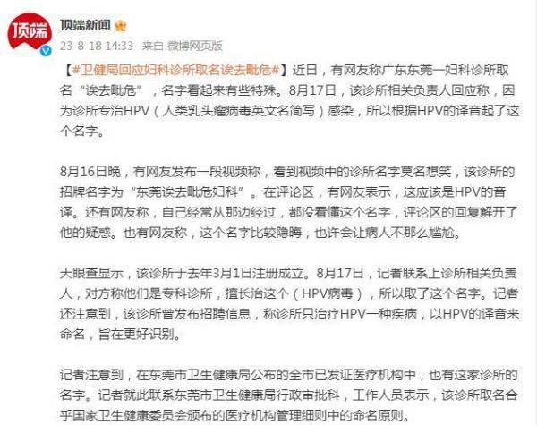 近日,有網友稱廣東東莞一婦科診所取名“誒去毗?!保挚雌饋碛行┨厥狻?月17日,該診所相關負責人回應稱,因為診所專治HPV(人類乳頭瘤病毒英文名簡寫)感染,所以根據HPV的譯音起了這個名字。