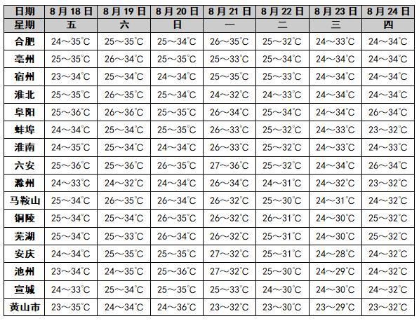 下面來看省城合肥,今天下午到明天白天:晴天到多云。偏東風2-3級。明晨最低氣溫:24-25℃。明天最高氣溫:34-35℃。20日起多分散性雷陣雨,最高氣溫32~35℃,最低25~27℃。降雨量較常年偏少3-5成,平均氣溫偏高2℃左右。