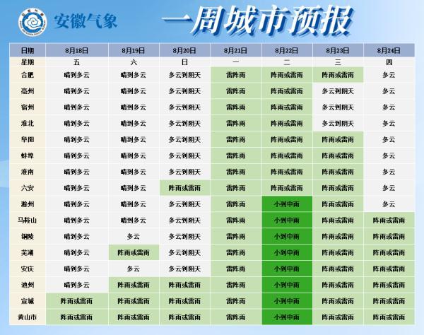 安徽氣象發布,未來三天江北以多云天氣為主,沿江江南晴雨相間。21-23日我省多陣雨或雷雨天氣,其中22日淮河以南部分地區中雨,局部大雨。24日大別山區和沿江江南部分地區午后有陣雨或雷雨。今天至21日全省最高氣溫普遍33~35℃。22日后我省大部分地區最高氣溫普遍低于34℃。