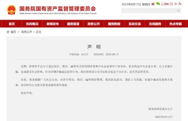 近期,持續有不法分子通過短信、微信、QQ等形式冒用國資委和中央企業領導干部身份,甚至偽造中央企業公章、公文實施詐騙,造成惡劣社會影響。針對涉嫌詐騙違法犯罪行為,我們將商請公安司法機關依法予以打擊,追究其法律責任。